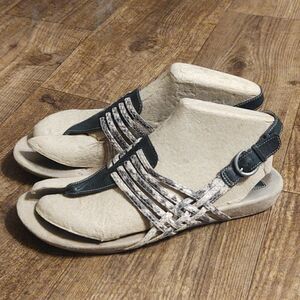 Very comfortable pair of walking sandals by Clarks featuring a combo snake skin with black strap thong sandal
