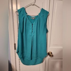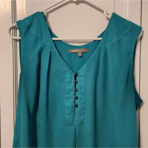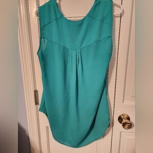 Super cute green tank with covered shoulders and button accents. Elegant cute. M