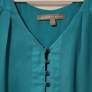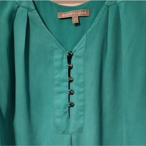love this. high low cut with thicker shoulders so very flattering. buttons on v neck super cute and trendy. green is fantastic. like an ocean green. size med.