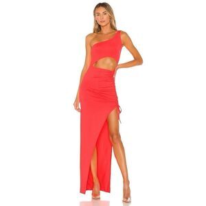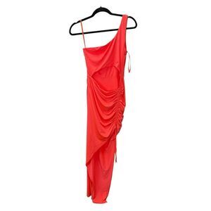 cutout dress, neon pink, coral dress, one-shoulder, ruched detail, bodycon maxi, high slit, summer dress, vacation-ready, stretchy, Superdown, Revolve dress, party dress, going out outfit, M size, clubwear