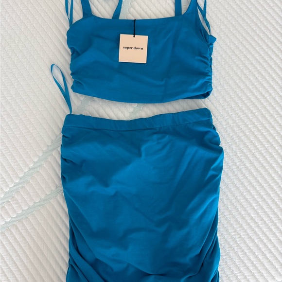 Stylish blue two-piece set by Superdown. Includes a crop top and skirt.