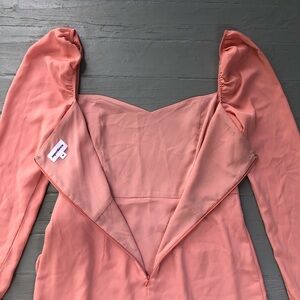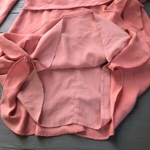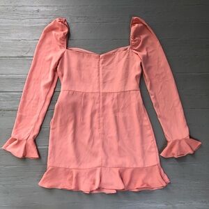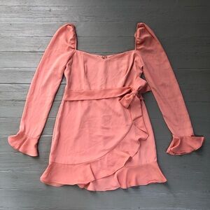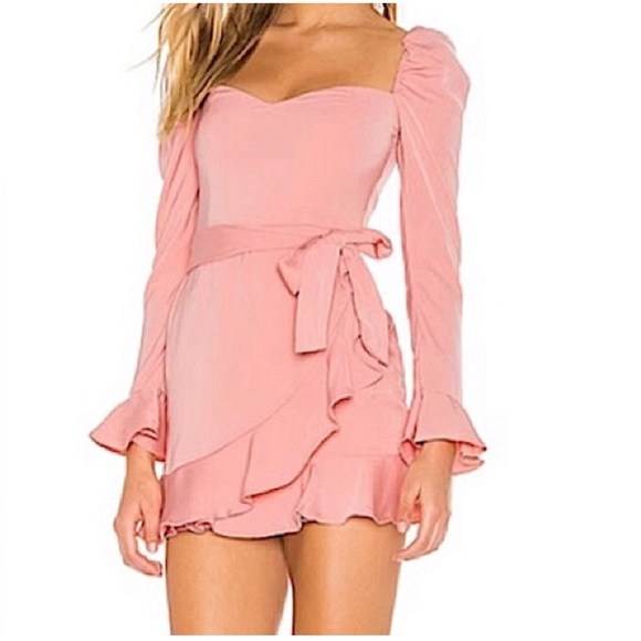 Elegant blush mini dress with long sleeves. Features ruffle cuffs and a sweetheart neckline. Wrap-style skirt with a tie waist.