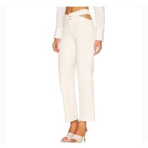 A statement pair of pants from Superdown, sold at Revolve, featuring an on-trend high-waisted fit with a bold cutout detail on the right hip. These off-white pants are a wide-leg style, perfect for creating a chic and modern look. The pants have a double snap button and zip closure.