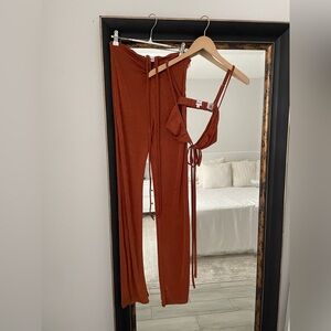 Chic rust jumpsuit with a unique cutout design. Straight leg fit. Perfect for a bold look.