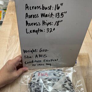 Across bust = 16", across waist = 13.5", across hips = 18", length = 32".