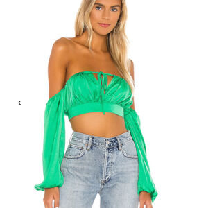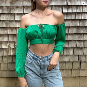 New Superdown Reyba Off Shoulder Crop Top Green Satin Keyhole Long Sleeve Sz XS