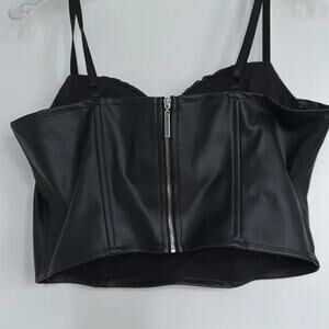 Self: 50% polyurethane, 50% poly.Lining: 100% poly. Made in China. Hand wash. Exposed back zipper closure. Adjustable shoulder straps. Padded cups. Lightly boned bodice.