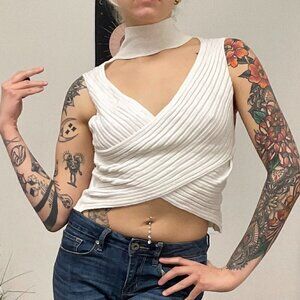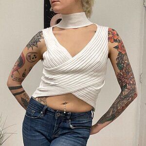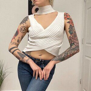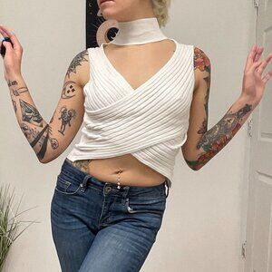 Superdown Slim Halter O-Neck Knitted Crop Top Sleeveless Size L White