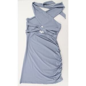 Superdown Suzette Dress Blue Gray Mini Ruched Cutout Tie Stretch Knit Halter L