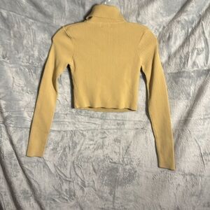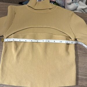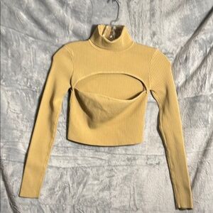 Elevate your style with this chic yellow ribbed turtleneck top. Featuring a trendy cutout design, it's perfect for a modern, sophisticated look. This color name is toast. This sweater is in good preowned condition. Tiny snag no hole in sleeve in picture