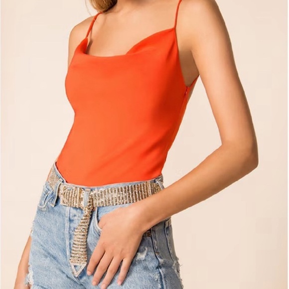 Bright orange tank with a stylish cowl neck. Perfect for casual outings.