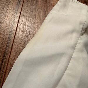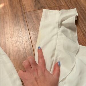 Chic backless design with ruffle accents. Perfect for elegant occasions. Small stain on left chest. Can come out with bleach I just have not tried. Worn only once. Comes from a smoke free home. No rips!