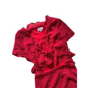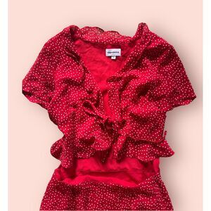 Short sleeve, plunge, heart print, polka dot print, ruffle accents, cut outs, red, vacation, short