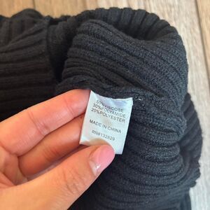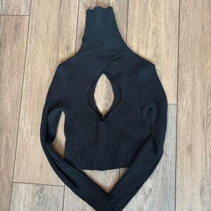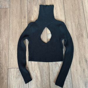 black keyhole, ribbed knit, cutout detail, cropped sweater, long sleeve, fitted top, turtleneck, sleek style, no distress, minimal design