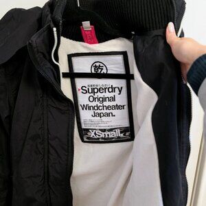 Superdry Black Original Windcheater Jacket in XS. Well-loved but still has life left in it. Great for keeping you warm. Has thumbholes for the ribbing in the sleeves.