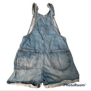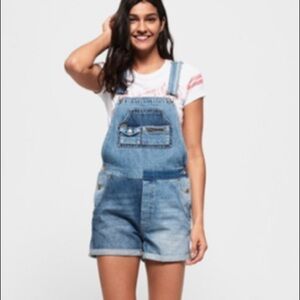 Superdry women's denim cut off dungarees. These dungarees are crafted from denim, giving them a relaxed feel that's perfect for the everyday. Featuring all the classic dungaree detailing including adjustable shoulder straps, as well as popper and zip fastened pockets on the front, and a button fastening. These cut off dungarees are completed with a metal Superdry logo badge on the front pocket.