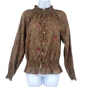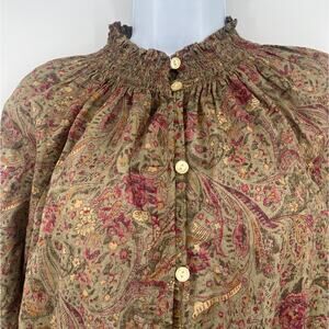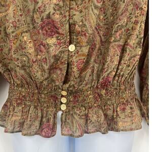 Olive Superdry Paisley Smocked Peplum Blouse Ralph Lauren Style Boho Prairie Top