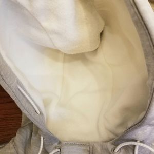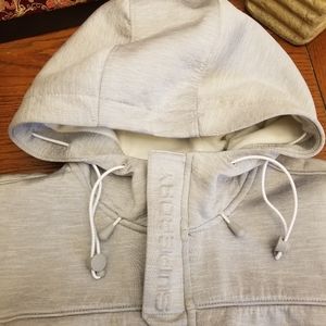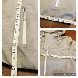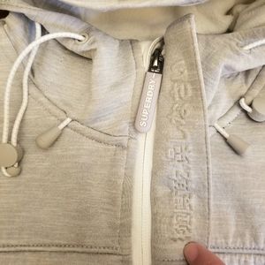 EUC - Women's Superdry Hooded Windtrekker Jacket, fleece lined, adjustable hood, front zipper closure, two size pockets w/zipper closure, one interior pocket w/button snap, 52% cotton, 43% polyester, 5% elastane, color is light gray, size Small (6).