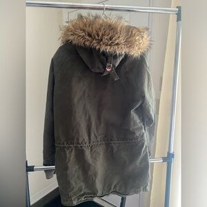 Superdry International Jacket. Has a detachable hood, and is very warm to wear! The zipper has broke off, but I would wear it with just the buttons.