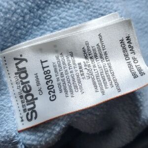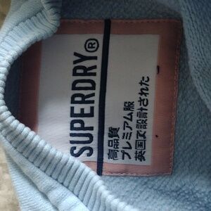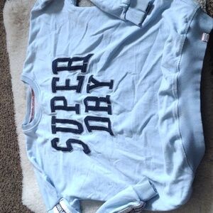 Light blue sweatshirt with bold black 'Superdry' lettering. Comfortable and stylish.