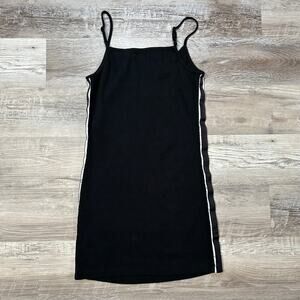 Sleek and stretchy ribbed bodycon tank dress by Superdry with sporty racer stripe sides. Scoop neckline and adjustable straps. Super soft and flattering with a vintage Y2K streetwear vibe.