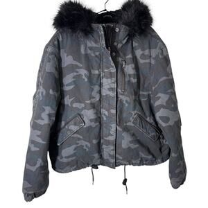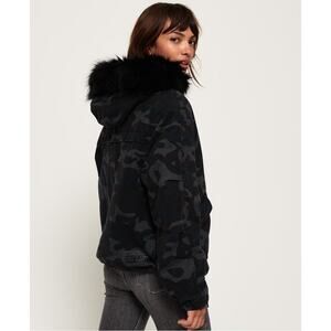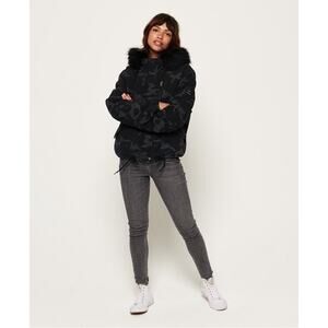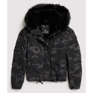 Superdry Toya Rookie Parka Jacket in Black Camo Faux Fur Lined US 12 Winter Warm