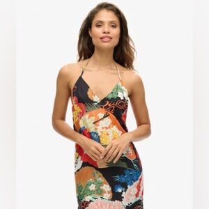 This Superdry dress combines a vibrant Asian inspired scene with a chic scrappy halter neckline, perfect for resort wear. The sleeveless slip design offers a breezy elegance, making it ideal for cocktail occasions. Its midi length adds a touch of sophistication to any wardrobe.