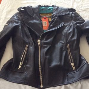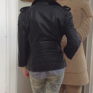 A stylish black leather jacket with turquoise satin inside. Silver zippers. New. Never worn.