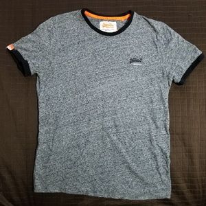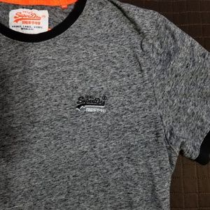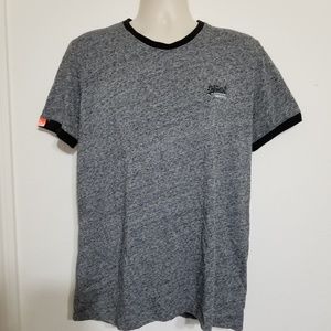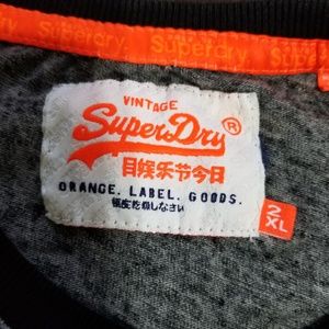 NIce Superdry tee. Grey heather with black knit collar and sleeve hem. Well made shirt, with nice weight/thickness to it. logo on sleeve and chest. no flaws. size 2xl, though superdry tends to size smaller. measurements on last pic