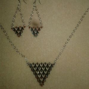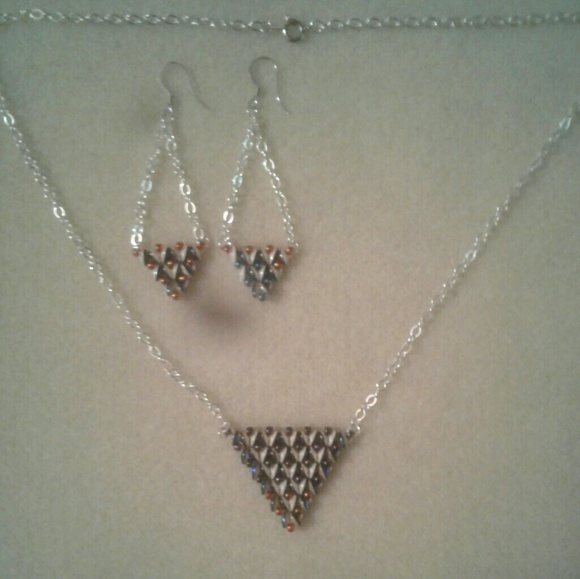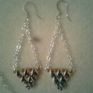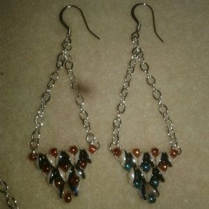 Silver plated chain approx 16in long adorned with duet superdous, orange,blue,and green seed beads 8/0s all held together with a silver locking hoop clasp. The earring are made with the same chain the are on stainless steel posts approx 4in long matching duet superdous and seed beads. Simplisticly beautiful!! This peice will hand below the collar bone and atop of the cleavage area.