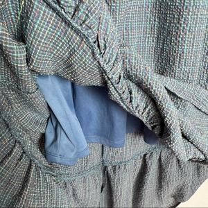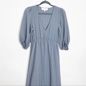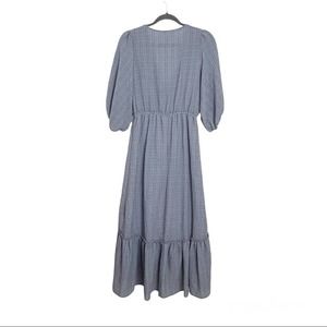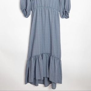 Dainty blue plaid peasant dress. Deep v-neck. Elbow length puff sleeves. Tiered high low hem. Size small.