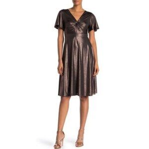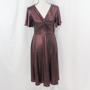 Superfoxx Women's Shimmery Knot Front Short Sleeve Dress. Size Medium, New with tags. Black/copper/pink. 96% Polyester, 4% Spandex.