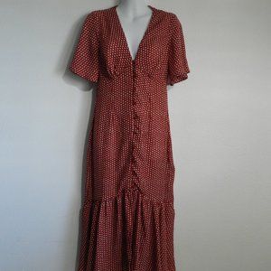 Superfoxx button down, flutter sleeve, open back, red and cream polka dot maxi. V neckline with defined gathered bust. 15" deep flouncy ruffled hem. Light chiffon fabric