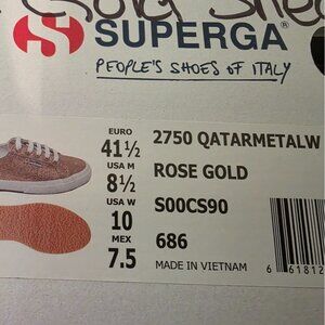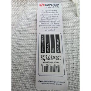 These Superga 2750 Fantasia sneakers in rose gold offer a blend of style and comfort. Featuring a vulcanized rubber sole and cotton lining, they are perfect for casual wear. Brand new and in pristine condition, they come in their original packaging, ensuring quality and authenticity.