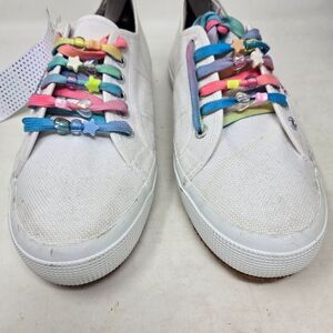 Stylish Superga 2750 sneakers in white with vibrant multicolor laces. Perfect for adding a pop of color to any outfit. They are a women's size 10W | 8.5M. They are new with tags but were a floor model and have some black surface markings. I did not try to get them out. Please see all photos as this is the exact pair you will receive. Thank you so much for looking. I am always open to reasonable offers. Have a fantastic day!