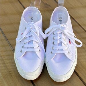 Crisp white canvas sneakers by Superga. Easy slip-on style. Ideal for everyday comfort. New with out box size 39 1/2