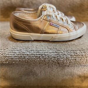 Stylish Superga sneakers with a metallic gold finish. Features white laces and rubber soles. Perfect for casual wear.