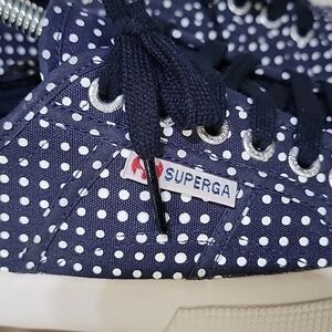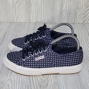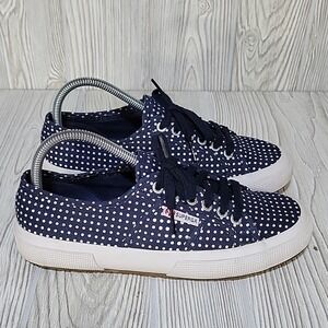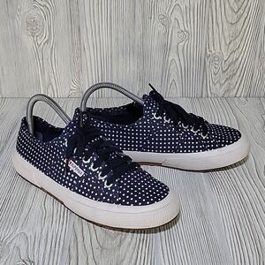 Stylish navy sneakers with white polka dots. Comfortable and trendy design. Perfect for casual wear.