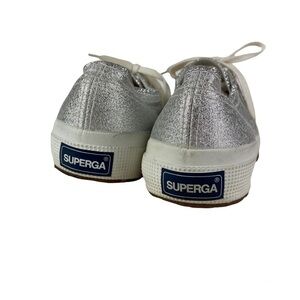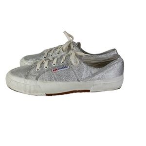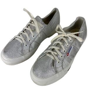 This is a pair of Superga platform sneakers. Metallic silver. Lace up tie. Size 37 or size 6.5. See Picture of Superga size chart below. Excellent gently used condition.