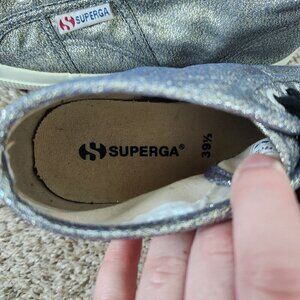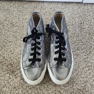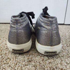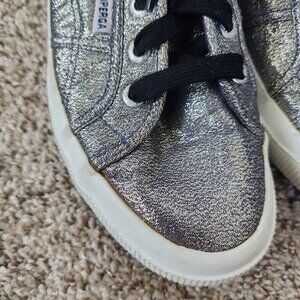 These shoes are by Superga. They are low top trainers in a silver metallic gray with black laces. They are lace up with rubber solves. They are in excellent pre-owned condition with no holes, rips or stains. There is minor general wear. Bundle with other items in my closet to get the most out of shipping!