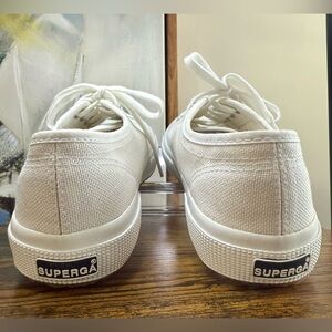 Stylish white canvas sneakers by Superga. Features lace-up design and durable rubber sole. Great Condition (NWOT)