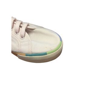 The Superga Stripe Women's Athletic Sneakers in a Rainbow Color are designed for casual occasions. The canvas of these has a light tan / pink color to them. These lace-up sneakers are comfortable and durable, making them ideal for everyday wear. They are pre-owned and in good condition, showing some wear as depicted in the photos but still have plenty of life left. Size women’s 10