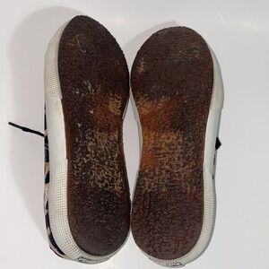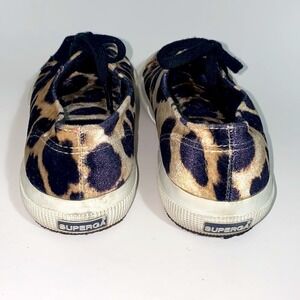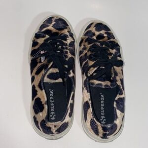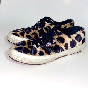 Superga leopard print lace up sneakers. Velvet feel to the pattern. Rubber soles. Size 39. Size 8