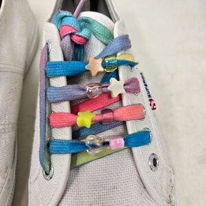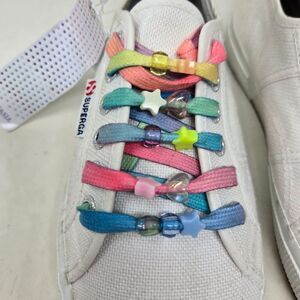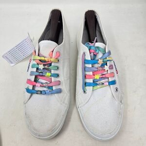 Stylish Superga 2750 sneakers in white with vibrant multicolor laces. Perfect for adding a pop of color to any outfit. They are a women's size 10W | 8.5M. They are new with tags but were a floor model and have some black surface markings. I did not try to get them out. Please see all photos as this is the exact pair you will receive. Thank you so much for looking. I am always open to reasonable offers. Have a fantastic day!