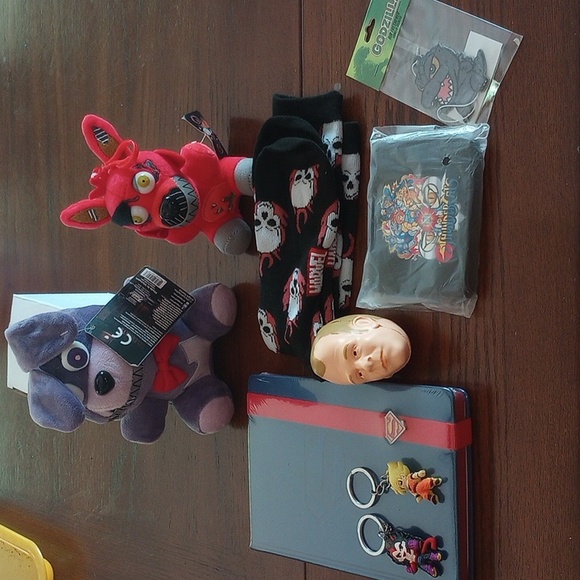 Superman journal (unopened so unsure if this is lined), skull socks, 2 scary plushies, 2 keychains, head squishy stress reliever, Godzilla, air freshener, Thunder Cats wallet