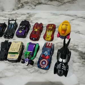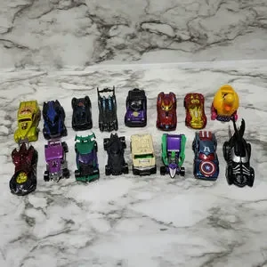 Lot of 16 DC Comics and Marvel cars, in good used condition. Includes some Hot Wheels and some from other sources. Cars with Batman, Captain America, Ironman and others.