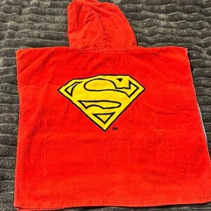 Let your child transform into their favorite superhero with this vibrant Superman hooded towel poncho. Featuring bold red and blue colors, it's perfect for imaginative play and cozy comfort. Good used condition.