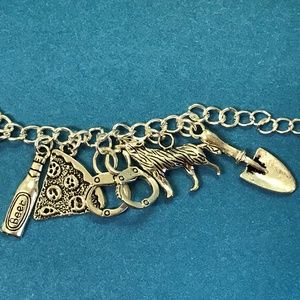 Silver toned Supernatural charm bracelet has 19 charms, fits wrists up to 9 inches, lobster clasp. Charms include: