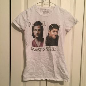 White Supernatural graphic t-shirt. Runs small (doesn't fit like medium) and has a couple small holes at bottom of shirt. (first image of the style of the shirt, not the shirt I am actually selling).