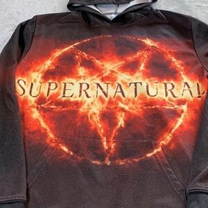 Hooded sweatshirt with pockets featuring the pentagram in flames from the television show Supernatural